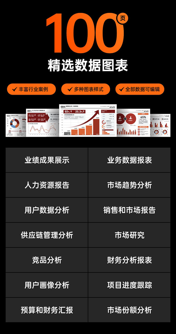 所有页面元素可以编辑,图表数据也可编辑。各种图 表模版都有,替换下自己的内容就能使用了,大大节 省了时间,超级实用!